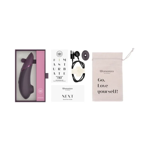 - Package contains: Womanizer Next, Cotton storage pouch, Additional stimulation head, Quick start guide, Compliance & Safety Information, #Imasturbate sticker, USB cable with magnetic charging pins (AC adapter not included)